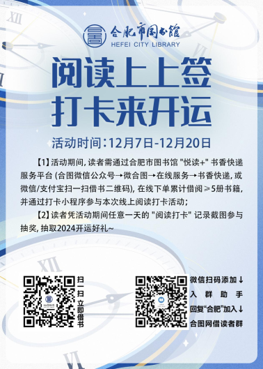 活动内容:活动期间,读者需通过合肥市图书馆“悦读+”书香快递服务平台,在线下单累计借阅≥5册书籍,并通过打卡小程序参与本次线上阅读打卡活动;同时读者凭活动期间内任意一天打卡记录截图即可参与抽奖,抽取2024开运好礼~