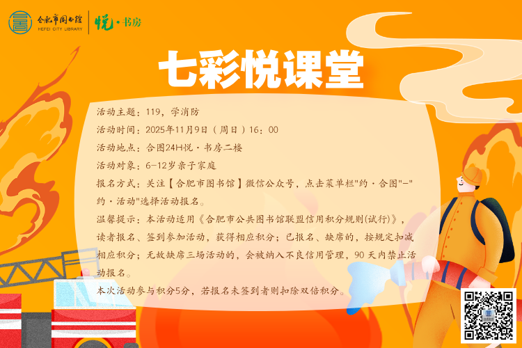 温馨提示:本活动适用《合肥市公共图书馆联盟信用积分规则(试行)》,读者报名、签到参加活动,获得相应积分;已报名、缺席的,按规定扣减相应积分;无故缺席三场活动的,会被纳入不良信用管理,90 天内禁止活动报名。