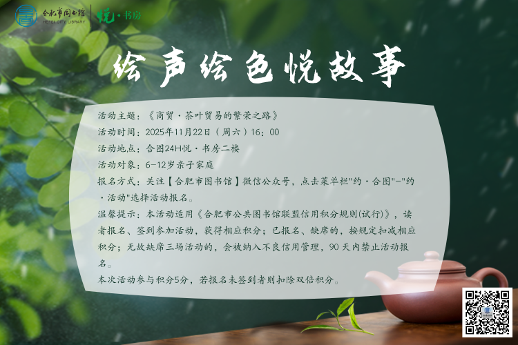 报名方式:关注【合肥市图书馆】微信公众号,点击菜单栏"约·合图"-"约·活动"选择活动报名。