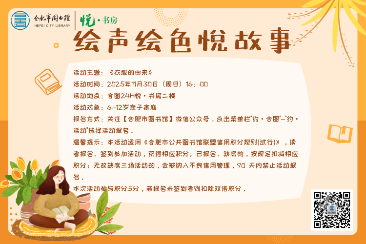报名方式:关注【合肥市图书馆】微信公众号,点击菜单栏"约·合图"-"约·活动"选择活动报名。