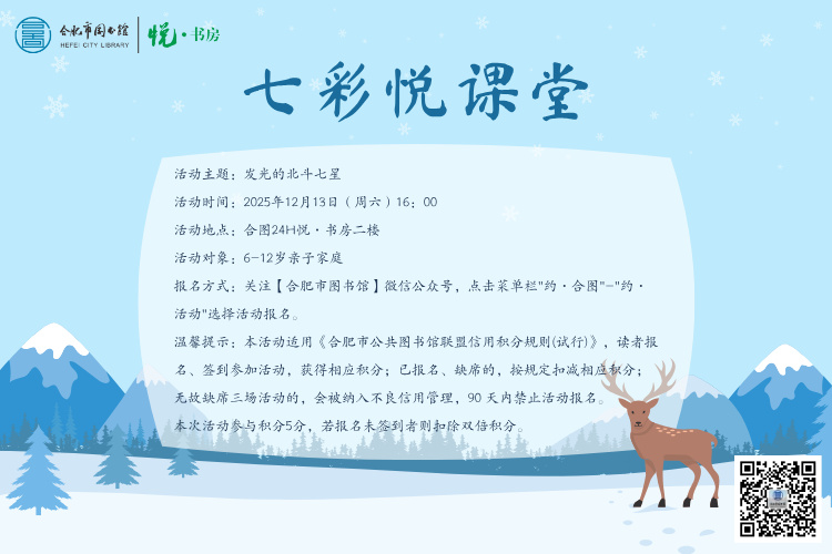 温馨提示:本活动适用《合肥市公共图书馆联盟信用积分规则(试行)》,读者报名、签到参加活动,获得相应积分;已报名、缺席的,按规定扣减相应积分;无故缺席三场活动的,会被纳入不良信用管理,90 天内禁止活动报名。