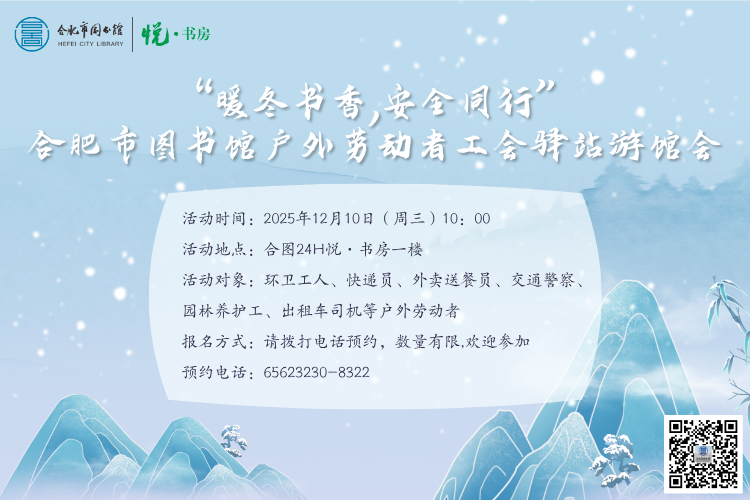 活动内容:冬日已至,寒风渐起。为丰富户外劳动者的精神文化生活,筑牢冬季安全防护防线,合肥市图书馆户外劳动者工会驿站特开展“暖冬书香,安全同行”户外劳动者工会驿站游馆会活动,以悠悠书香浸润心灵,用融融暖意驱散冬寒,向坚守岗位的户外劳动者们送上专属关怀。本次活动将邀请户外劳动者们走进合肥市图书馆,沉浸式参观馆藏空间与阅读区域;同时,还将开展阅读体验环节,分享冬季安全知识,让户外劳动者们在书香暖意中驱散寒意,收获实用安全技能,深切感受来自工会的关怀与温暖。