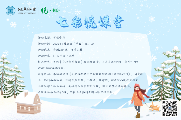 温馨提示:本活动适用《合肥市公共图书馆联盟信用积分规则(试行)》,读者报名、签到参加活动,获得相应积分;已报名、缺席的,按规定扣减相应积分;无故缺席三场活动的,会被纳入不良信用管理,90 天内禁止活动报名。