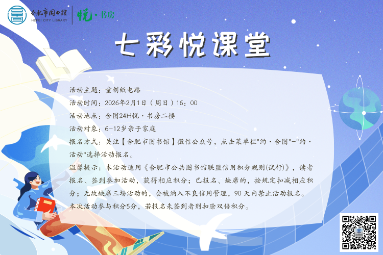 温馨提示:本活动适用《合肥市公共图书馆联盟信用积分规则(试行)》,读者报名、签到参加活动,获得相应积分;已报名、缺席的,按规定扣减相应积分;无故缺席三场活动的,会被纳入不良信用管理,90 天内禁止活动报名。