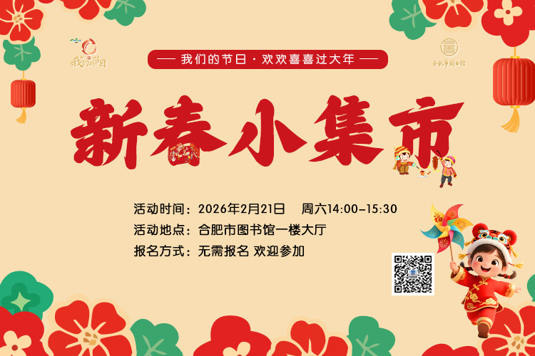 活动内容:新春到,游集市。大年初五,合肥市图书馆将于一楼大厅开展新春小集市活动,诚邀读者提笔寄愿、执杆锤丸、对弈品艺、拓扇留痕,在沉浸式体验中赏年俗之韵,品文化之萃,与家人携手参与亲子互动,悦享温馨欢乐时光,共筑新春乐读之境。