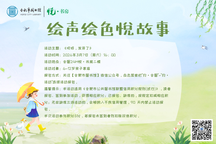 温馨提示:本活动适用《合肥市公共图书馆联盟信用积分规则(试行)》,读者报名、签到参加活动,获得相应积分;已报名、缺席的,按规定扣减相应积分;无故缺席三场活动的,会被纳入不良信用管理,90 天内禁止活动报名。