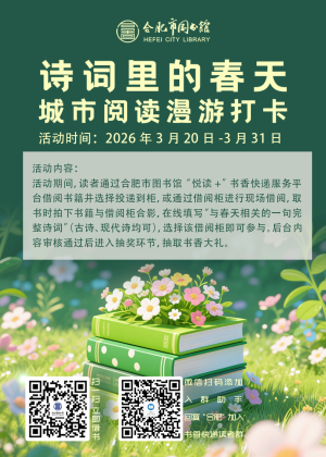 活动内容:活动期间,读者通过合肥市图书馆“悦读+”书香快递服务平台借阅书籍并选择投递到柜或通过借阅柜进行现场借阅,取书时拍下书籍与借阅柜合影,在线填写“与春天相关的一句完整诗词”(古诗、现代诗均可),选择该借阅柜即可参与。后台内容审核通过后进入抽奖环节,抽取书香大礼。